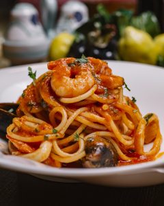 ( fetuccinis al dente, bañados en cremosa salsa alfredo con Trozos de jamón ingles con abundante queso parmesano).